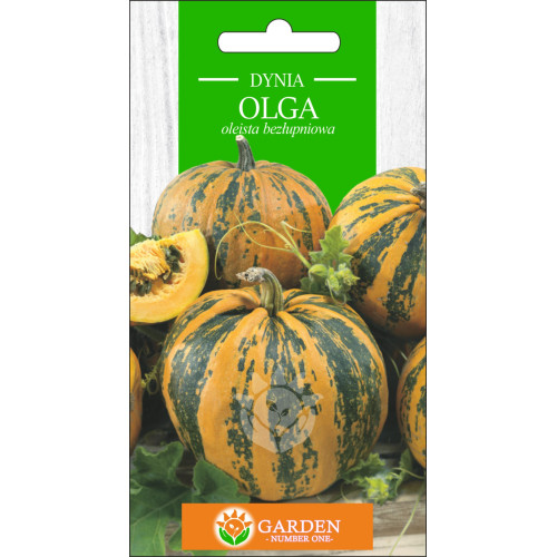 Dynia Olga to odmiana o specjalnym przeznaczeniu, uprawiana głównie w celu produkcji smacznych nasion bez twardej skorupy. Jest to odmiana niskorosnąca, o owocach o wadze do 3-5 kg, pomarańczowych z zielonymi paskami. Nasiona są oliwkowozielone, bogate w witaminy B6, B12, D, E, błonnik i magnez. Sadzona w kwietniu-maju w rozstawie 100x130 cm. Zbiór we wrześniu-październiku. Idealna do obróbki kulinarnej, pieczenia i produkcji oleju.
